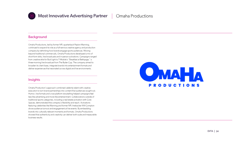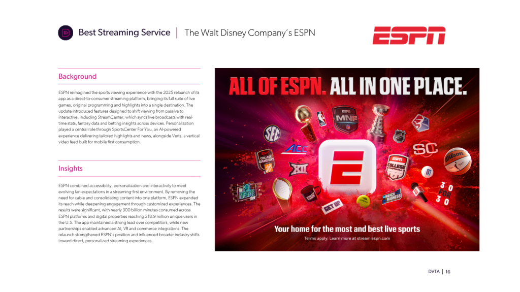 The Walt Disney Company was awarded Best Streaming Service for redefining sports viewing through ESPN’s direct-to-consumer platform. By consolidating live games, original programming and highlights into a single app, ESPN expanded access while introducing features that made viewing more interactive and personalized. Tools like StreamCenter and AI-driven highlights tailored content to individual fans, while mobile-first formats broadened engagement. The platform drove record consumption and digital reach, outperforming competitors and influencing wider industry shifts toward streaming-first models. In doing so, ESPN set a new standard for how sports content is delivered and experienced.