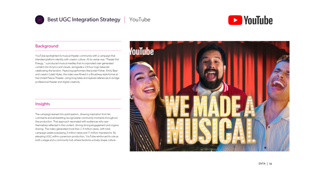 YouTube also secured the award for Best UGC Integration Strategy for spotlighting its musical theater community through a campaign that blended fan content with professional production. Centered on a 24-hour platform takeover and the original medley “Theater Kid Energy,” the effort wove user-generated content into a staged performance featuring creators and Broadway talent. Filmed to mirror a live production, the video incorporated fan references and comments, turning audience participation into storytelling. The campaign drew millions of views and strong engagement, demonstrating how YouTube can elevate community-driven content into shared cultural moments.