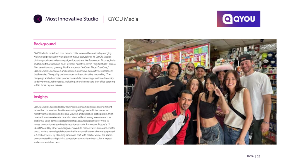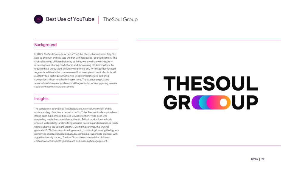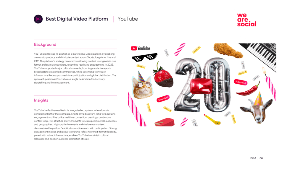 YouTube was named Best Digital Video Platform for proving it can deliver short-form, long-form and live content at an unmatched global scale. The platform enables creators to build audiences across formats while turning videos into shared cultural moments, from gaming communities surpassing one trillion views to record-setting live sports broadcasts. With reach spanning more than 230 countries and tens of millions of engagements, YouTube demonstrated its ability to sustain participation and influence across audiences. In a fragmented media landscape, it remains a central hub where creators, viewers and culture converge.