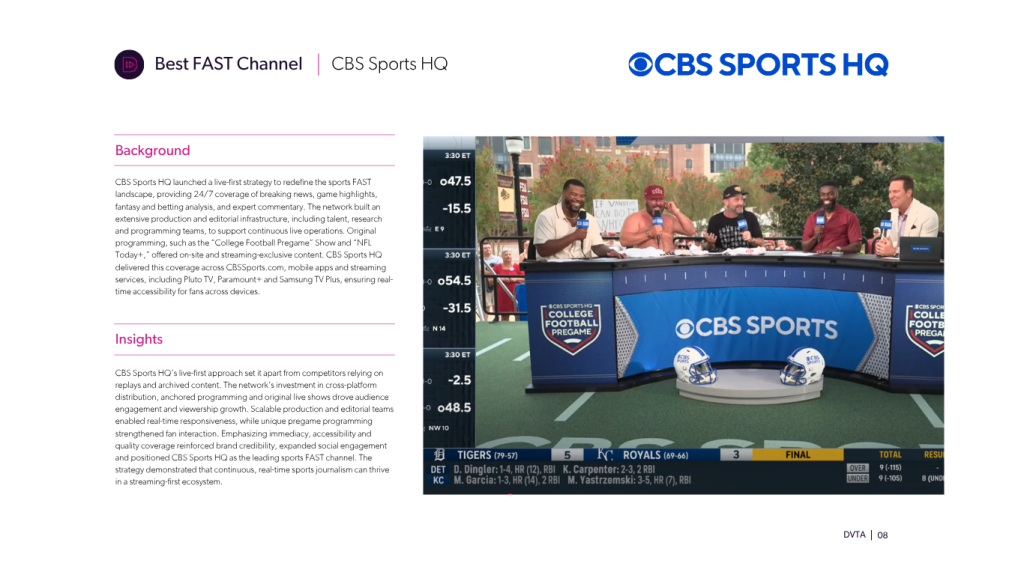 For Best FAST Channel, CBS Sports HQ clinched the win by redefining free streaming sports coverage with a live-first approach. Operating 24/7, the network delivers real-time news, highlights and analysis rather than relying on replays, supported by a full-scale production and editorial infrastructure. Its broad distribution across CTV, mobile and streaming platforms has driven record viewership growth and strengthened its reputation for immediacy and reliability. With original programming and continuous coverage, CBS Sports HQ has set a new standard for how live sports journalism operates in the FAST ecosystem.