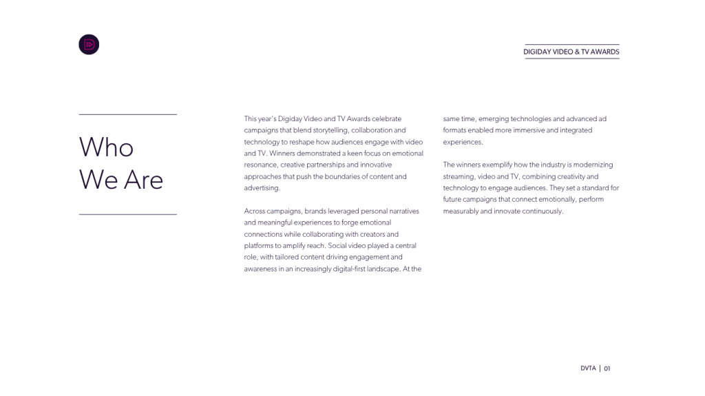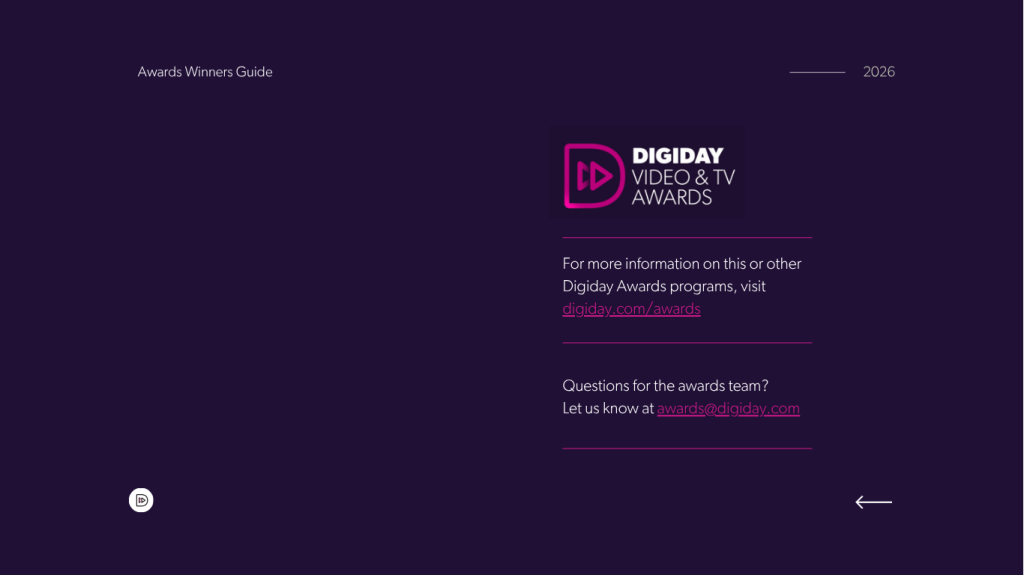 Explore all the 2026 Digiday Video and TV Awards winners below — including a quick rundown of the campaigns and insights into why they won and what marketing teams can learn from them. Download the complete guide here.