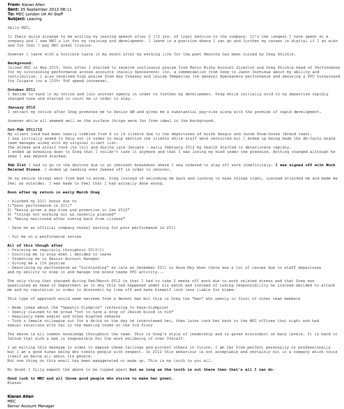 This media planner at MEC London pulled no punches with his resignation letter, accusing his boss of anti-semitism, having “sexual relations” in the office, and “ruining” eight months of his working life. Digiday quibble: Kieran buried the lede by not mentioning the after-hours meeting-room fornication until third-to-last paragraph. (Image from Dropbox)