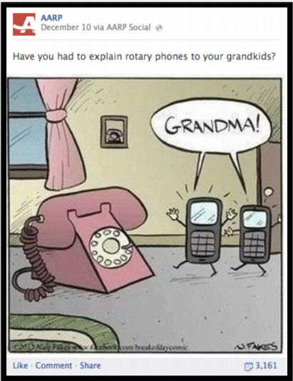 Nostalgia and content that shines light on generational gaps have been doing well for the brand. For example, a cartoon the company posted on Facebook Dec. 10, pokes fun at 50-plus consumers that have had to explain what a rotary phone is to their grandkids. The post was shared about 3,000 times, and AARP considers that a win. Another post that did well was a video of Bruce Springsteen dancing with his mom on stage at a concert.