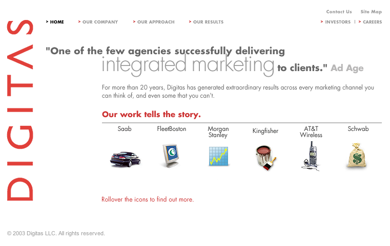 Digitas opted for a simple and clean approach to its site in 2003, and it didn’t use Flash like many of its competitors. Here’s how it looks now.