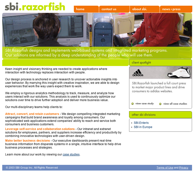 By 2004, Razorfish had been acquired by SBI and had taken on its branding. It didn’t even live on its own URL: razorfish.com redirected to sbigroup.com. After several more years and acquisitions, this is how the digital shop’s site looks now.