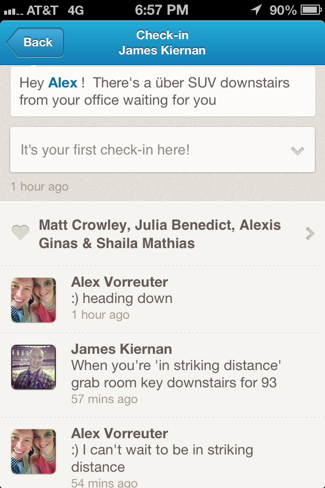But wait, there’s more. Like any good modern media plan these days, there was an earned media component. Kiernan’s proposal was noticed by Foursquare CEO Dennis Crowley, who retweeted it to his 59,000 followers and sent his congratulations. Uber’s community manager also reached out with best wishes.