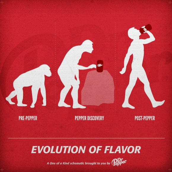 Last week, the soft drink Dr. Pepper found itself scratching its head over its seemingly mundane graphic it posted on Facebook. Based on the iconic “March of Progress” showing the evolution of man, Dr. Pepper found a way to illustrate man’s evolution with the discovery of the soft drink. An innocent graphic of ape to ape-man to man, and titled “Evolution of Flavor,” the image took off when Creationists took to Facebook believing Dr. Pepper was making a statement, supporting science.