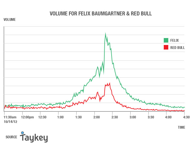 Here’s a chart from social ad platform Taykey showing the volume of social mentions of the event, delineating between those mentioning just Baumgartner and those with the brand. Overall, during the jump, Taykey found the event captured 1 percent of all social conversation, including Twitter, Facebook, YouTube and blogs. Over half the conversation of the event occurred on Twitter, Taykey found. “It’s clear that Red Bull’s brand was brought along on Felix’s back,” said Matt Rosenberg, vp of marketing at Taykey. “It’s a pretty spectacular achievement.”