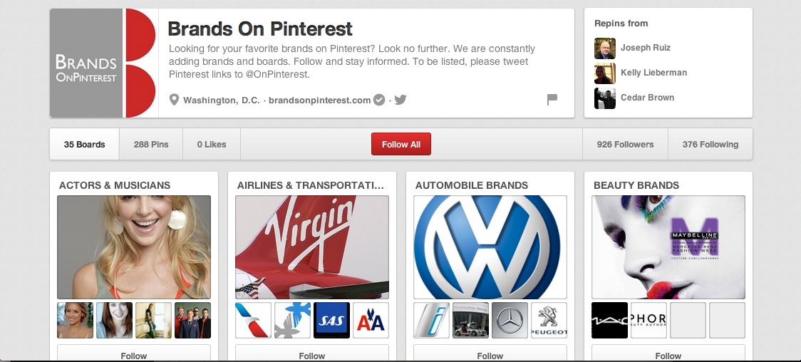 Brands on Pinterest: It’s not always easy to find the official Pinterest pages of brands. This Pinterest account features boards that organize brands on Pinterest by categories like beauty brands, automotive brands, fast-food brands, tech brands, media brands and more. There are 35 boards in total.