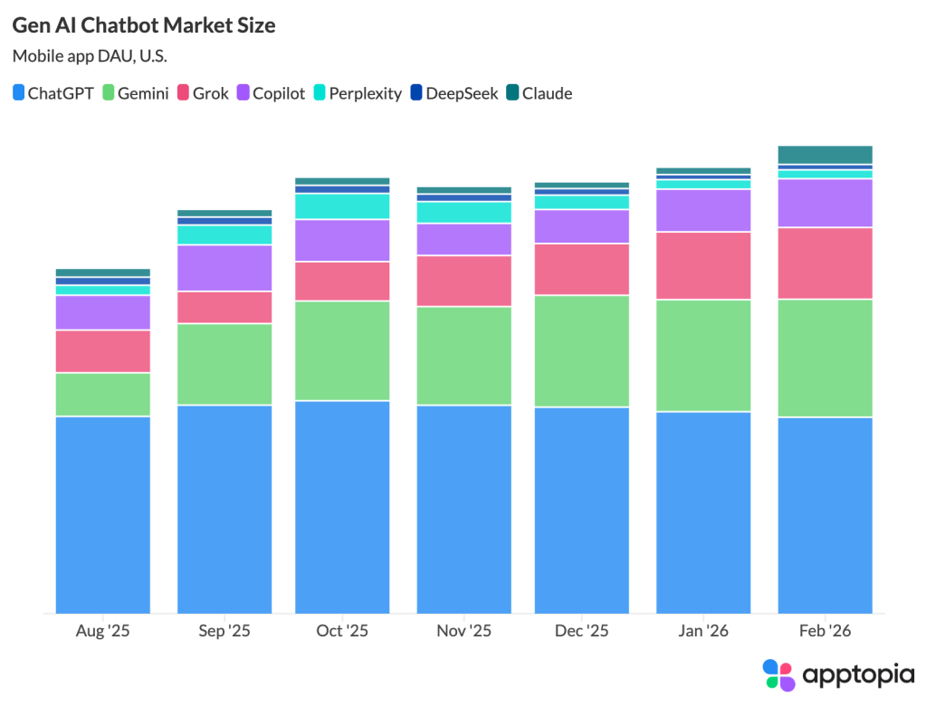 Anthropic’s Claude is growing a lot quicker — albeit from a lower base. In February 2026, the app roughly tripled its U.S. market share from 1.5% to 4%, and doubled worldwide, per Apptopia data. What’s even more interesting is Claude’s churn rate. In August 2025, it decreased from 55% to just 36% by February 2026, making it the largest churn improvement of any of the chatbot apps, per Apptopia.