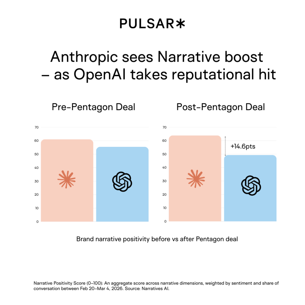 The Pentagon deal seemed to have a significant impact on brand perception. Before the contract was signed, Anthropic was slightly ahead when it comes to positivity around the brand’s narrative. According to Pulsar, which tracked sentiment and share of conversation between Feb. 20 and March 4, before the deal, Anthropic had a positive narrative score of 61.2 out of 100, while OpenAI’s score was 55.5 — a 4 percentage point difference.