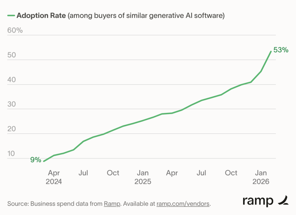 Ramp’s procurement data (drawn from real-world business transactions) shows that as of March 2026, 56% of organizations using a generative AI vendor use Anthropic — up from 29% a year ago. OpenAI, by contrast, currently has an overall business adoption rate of 84%, though that figure has slipped 2% since 2025.