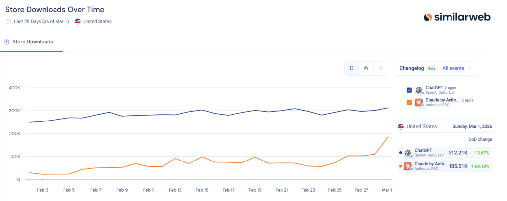 For the most part, OpenAI’s ChatGPT is growing from a much larger base, already around 900 million users, compared to Anthropic’s Claude’s 10 million daily active users, per Similarweb’s estimates. However, right after the Pentagon deal was announced on Feb. 28, downloads for Claude in the U.S. spiked.