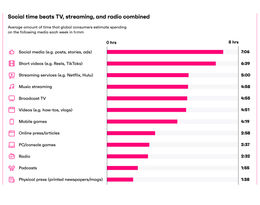 According to GWI’s Connecting the Dots 2026 report, on average, global consumers spend about 7 hours and 6 minutes per week on social media overall, and around 6 hours 39 minutes on short-form videos (Reels and TikTok) per week.