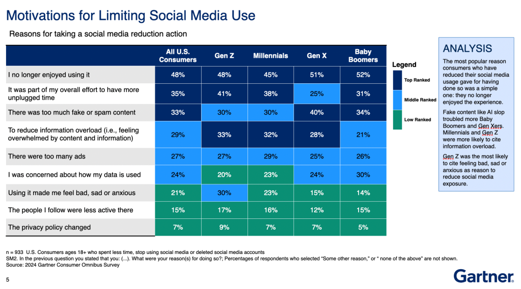 When looking specifically at the reasons behind their decision, Gartner found that across all ages, the biggest cited reason was no longer enjoying using it. In particular, Gen Z also cited information overload, and the fact that using the platforms made them feel bad, sad or anxious.