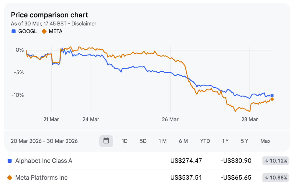 Following the L.A. verdict, Meta and YouTube (Alphabet) saw their stocks tank by about 8% and 3%, respectively. It was a huge loss for Meta, which was compared to Big Tobacco in the 1990s. And investors realized Meta’s protective legal shield might be ending.