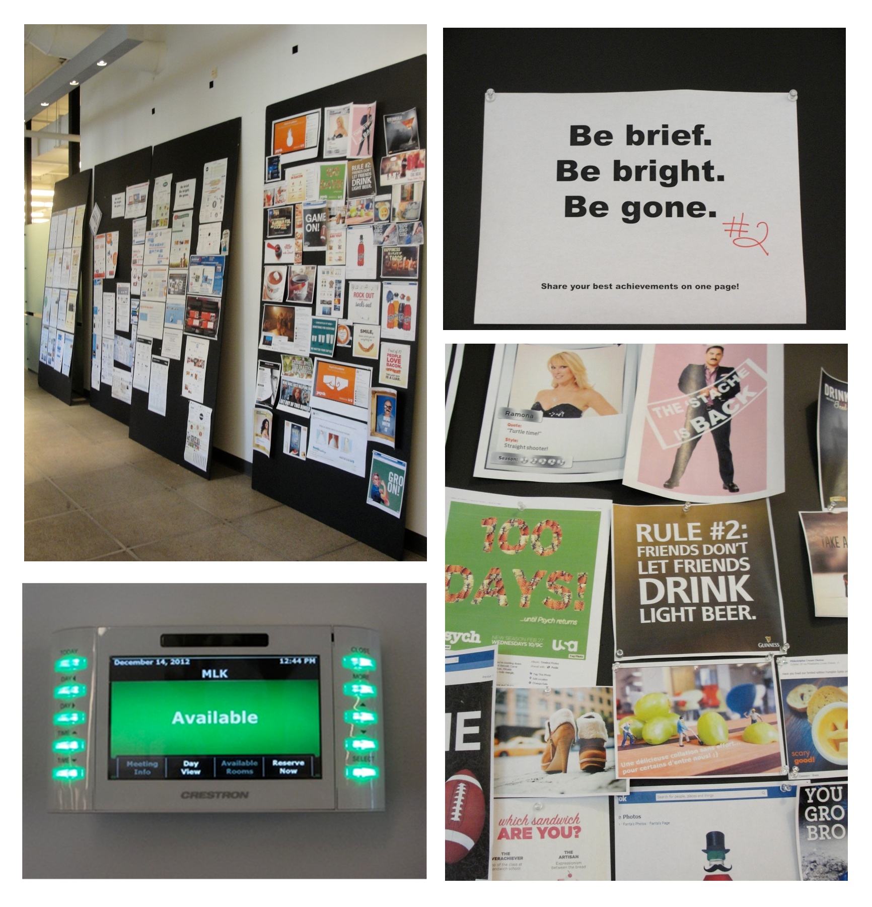 “This is one of the busiest hallways in the office, so we invite staffers to share their work in one-page summaries, highlighting the thinking and outcome behind a piece of work. The idea is to demonstrate the mantra ‘Be brief. Be bright. Be gone.’ We try to use it to foster inspiration and healthy competition. Our conference rooms are all named after famous leaders, and accompanied by a famous quote of theirs. We have a Steve Jobs, a Ghandi and a Martin Luther King, for example.”