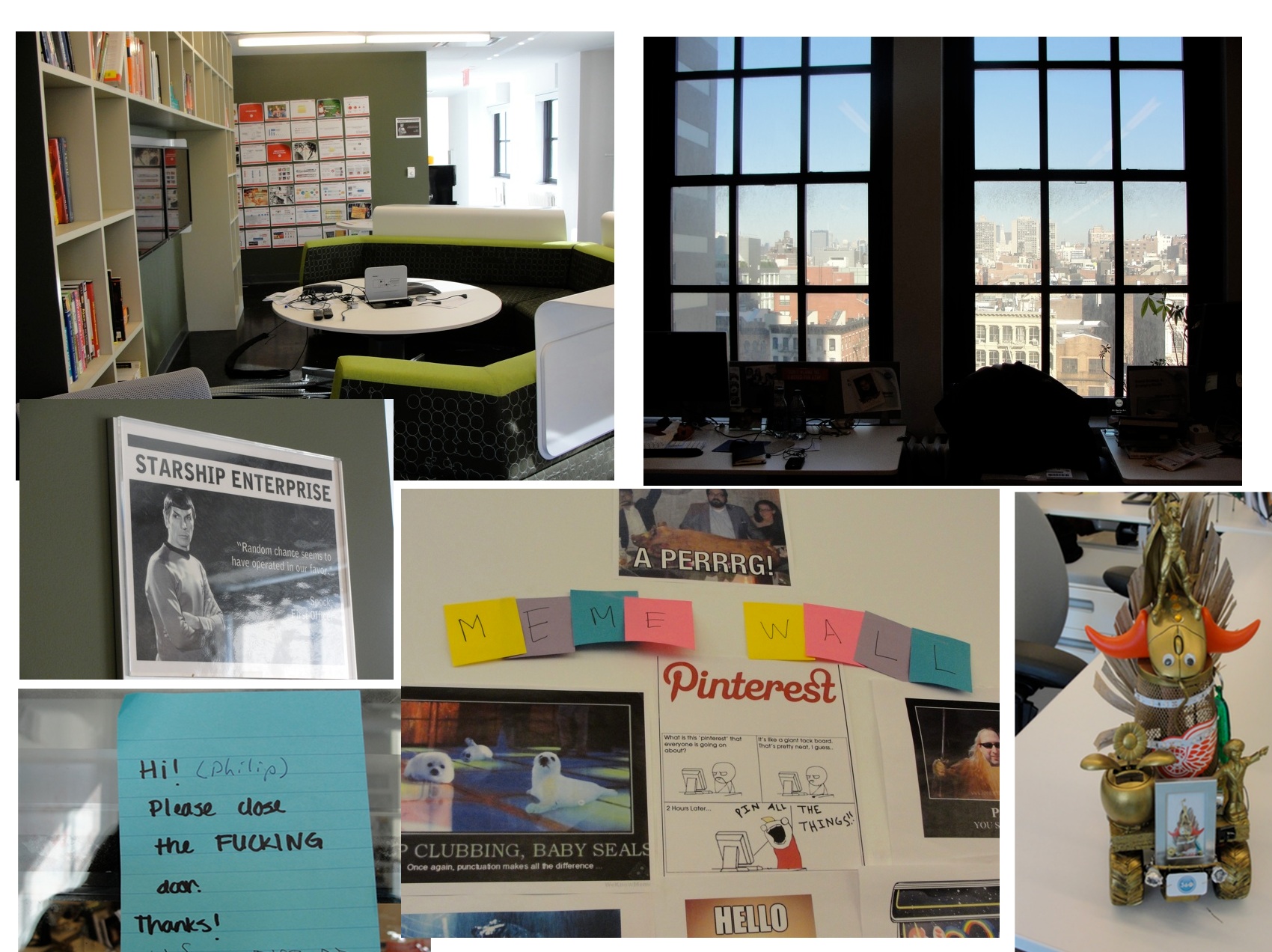 (Starship Enterprise brainstorming area, office decorations, Golden Mouse award)