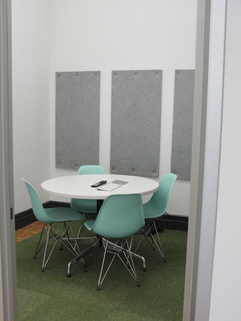 This is a more private space where people can make phone calls away from the open desk area. It has soft sound-proofing panels. “We call this the crying room. Sometimes bad news is delivered in here,” quipped Endres.