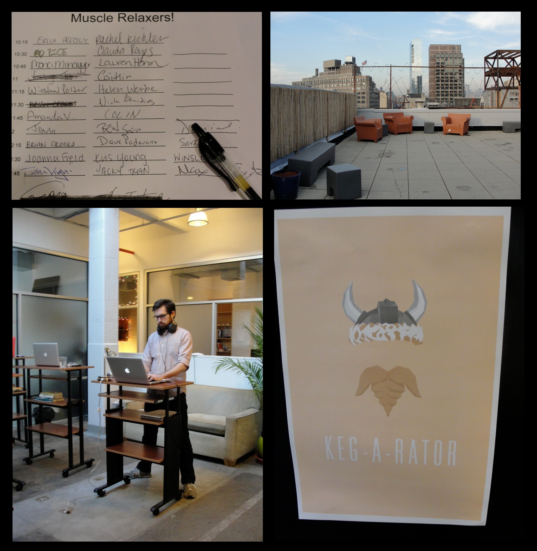 (A sign-up list for in-office massages, the company’s private roof-deck, and a standing desk work area.)
