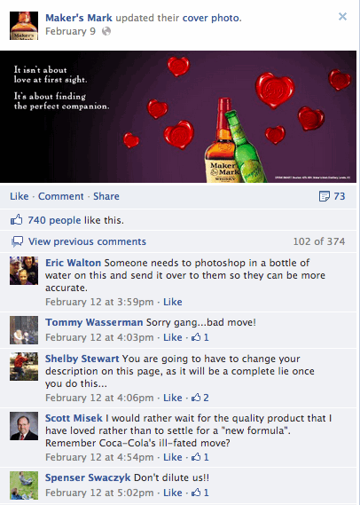 This being 2013 and all, that means social media outrage. In a time long ago — say five years ago — a brand could probably get away with this move. In fact, it’s something Maker’s Mark rivals have already done. But bourbon lovers are an ornery lot that likes their drinks like their women: strong.
