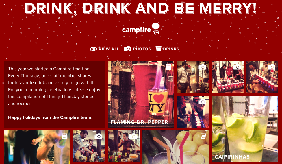 Inspired by its “Thirsty Thursdays” office tradition, Campfire has compiled some of its staffers’ favorite festive drink recipes and the stories that accompany them to create “Drink, Drink and Be Merry.”