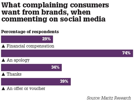 This isn’t just about research. Just go on Twitter and Facebook and view the comments from consumers to brands. Here’s just one example of how consumers interact with one brand in social. This works if you use the “F” word and any brand name on twitter. Is it any wonder that, according to Social Bakers, only 30 percent of consumers receive a response from a brand on Facebook?