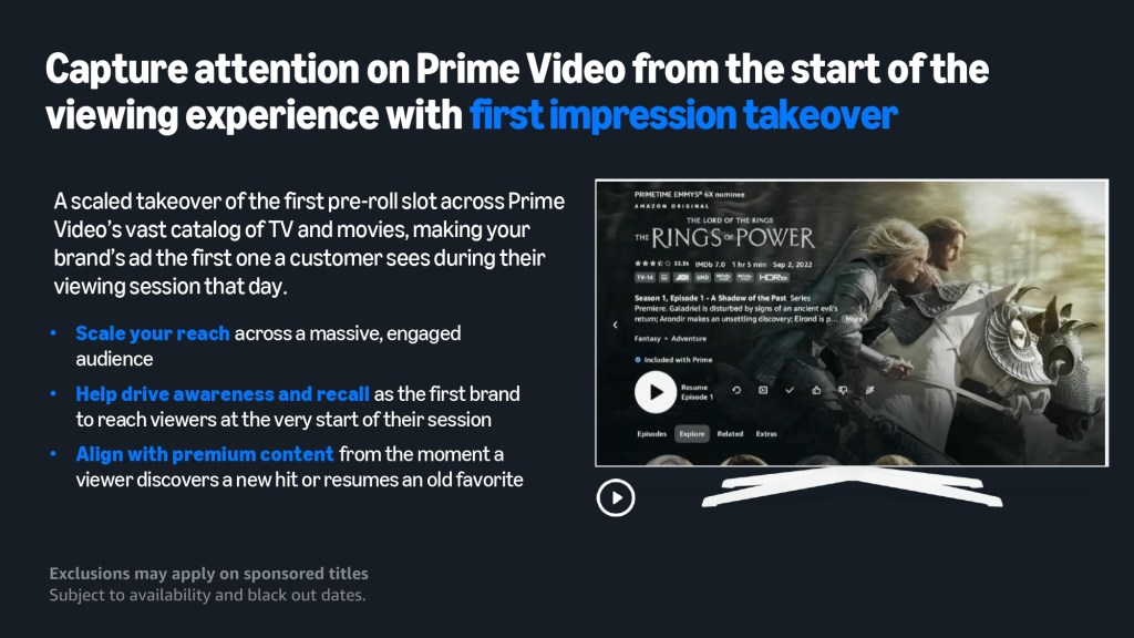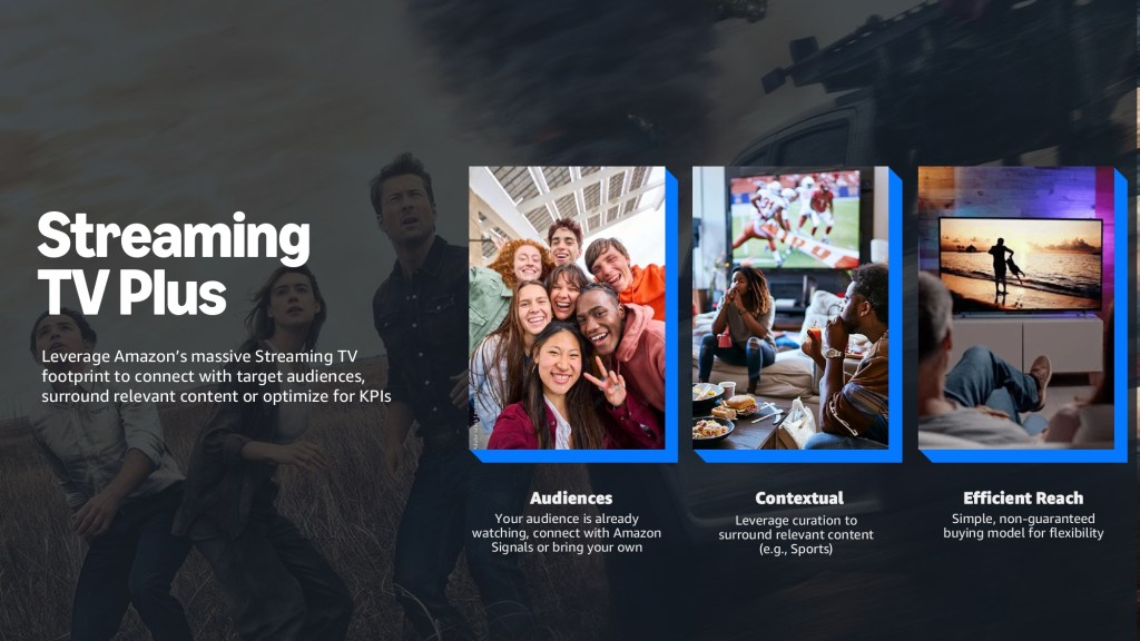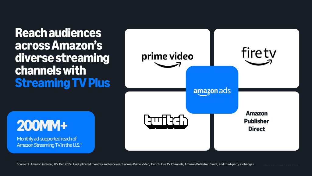 In a provided statement, an Amazon spokesperson touted accessing CTV inventory in one place. “Brands can advertise across Amazon properties, premium TV like Disney, Fox, and Roku, music services including Spotify and iHeartRadio, and throughout the open internet with control and transparency,” the spokesperson said. “Through strategic relationships with key industry players, we connect advertisers to 90% of all US households with authenticated, logged-in reach—providing the ability to holistically plan, optimize, and measure campaigns across all publishers with precision and greater performance.”