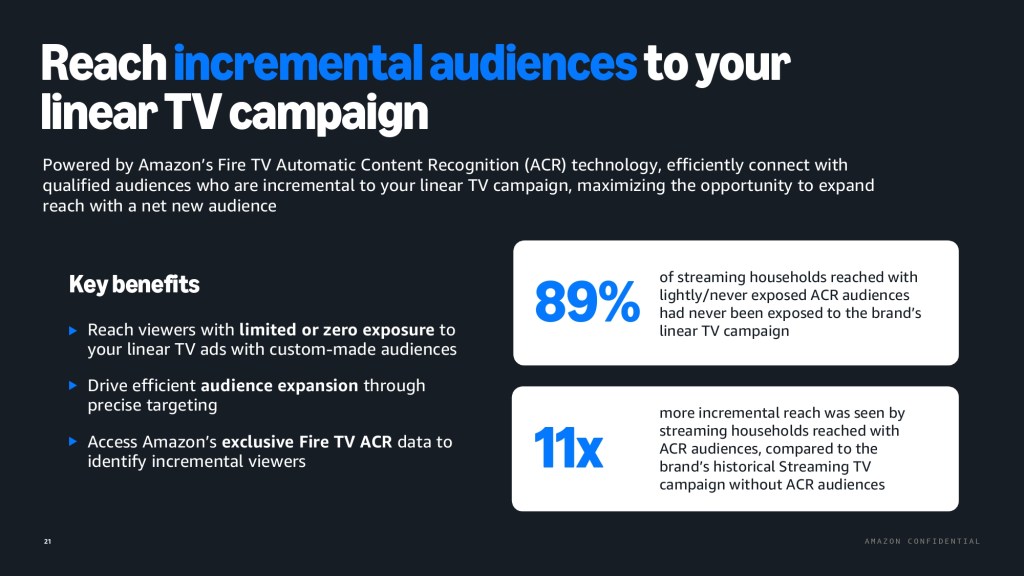 Still, even with these ongoing challenges, agencies are still prepared to move money into Amazon’s CTV via its demand-side platform because finance and performance teams now require defensible return on investment from TV. As Amazon’s deck stated, its CTV offering helps advertisers reach extra viewers they wouldn’t have otherwise reached on linear TV. The platform even goes as far as to say that 64% of its streaming users do not watch linear TV.
