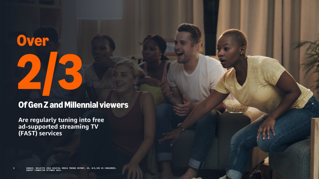 Taking a closer look at that audience, 20% exclusively watch free content, 45% of the audience are adult Gen Z or millennial, while the deck positions them as “ready to shop.”
