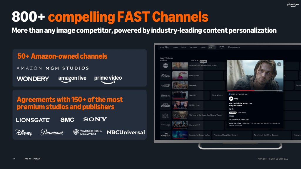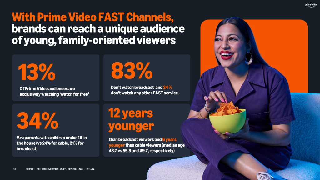 Amazon talks up its more than 800 free ad-supported streaming television (FAST) channels as a notable reach play through Prime Video and supplemented with FireTV channels, noting that advertisers can reach more than 55 million monthly viewers.