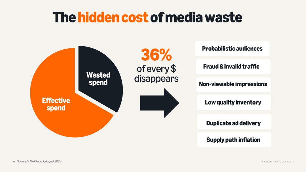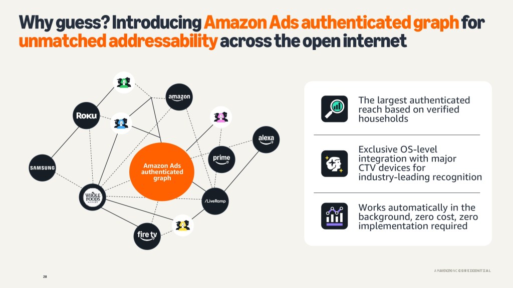 The deck moves on to talk through streaming TV more broadly, stating that 36% of every ad dollar is wasted through ineffective targeting, low quality inventory duplicate ad delivery among other hidden costs. Unsurprisingly, Amazon frames its DSP as a riposte to all of that, pitching it as a place advertisers can go to reduce waste by allowing them to target using accurate, authenticated signals. This is achieved via Amazon Ads authenticated graph for what the tech platform claims is unmatched addressability across the open web.