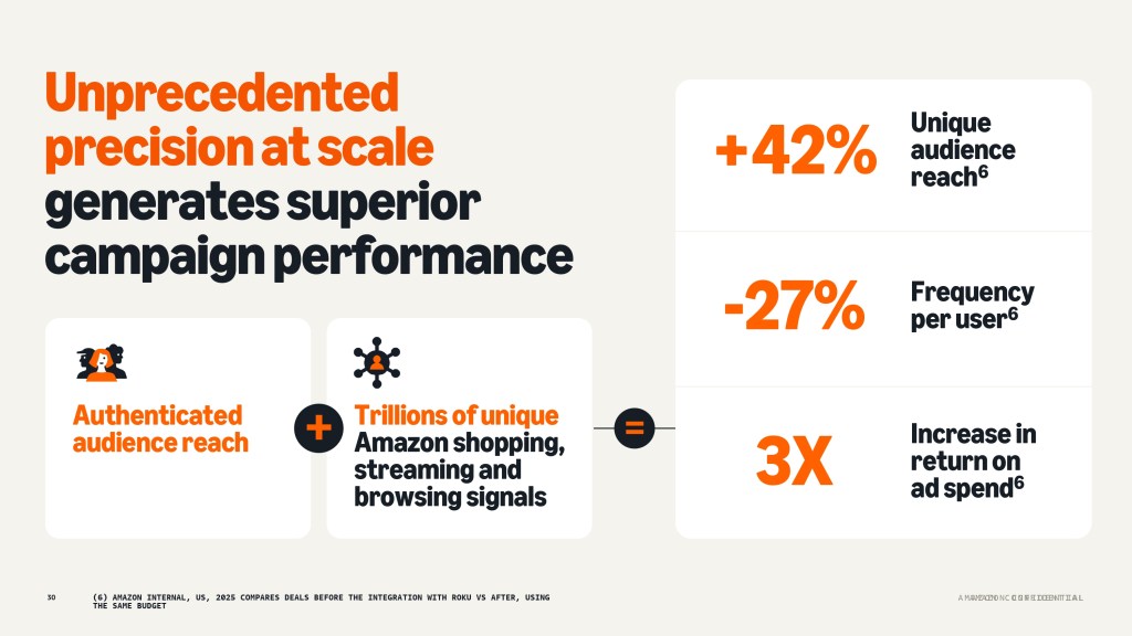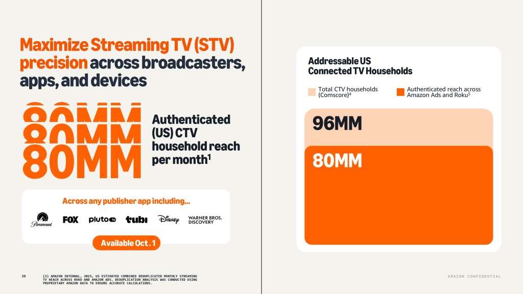 For instance, advertisers can target 80 million deduplicated U.S. CTV households across Amazon Ads and Roku, according to the company’s internal data, with much more precision across broadcasters, apps and devices, including Paramount, Fox, PlutoTV, Tubi, Disney and Warner Bros. Discovery (all since Oct. 1), using Amazon’s DSP.