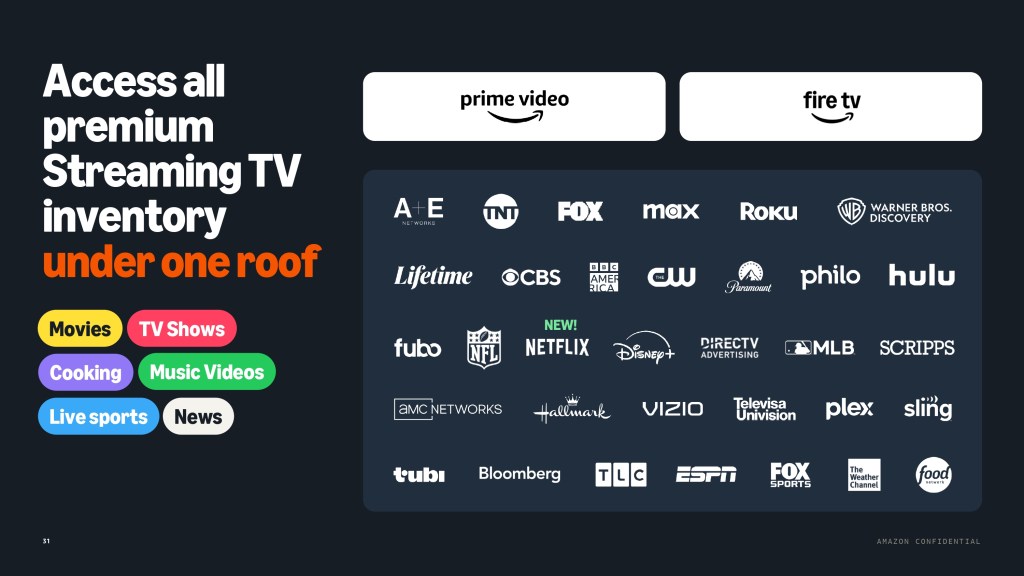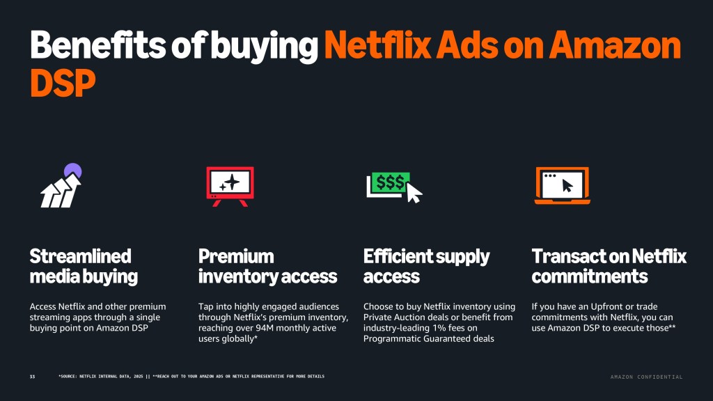 Netflix partnered with Amazon last September to make its ads more accessible via the platform’s DSP. And Amazon is using the partnership to position itself as a “one-stop-shop for premium Streaming TV inventory,” per the deck.