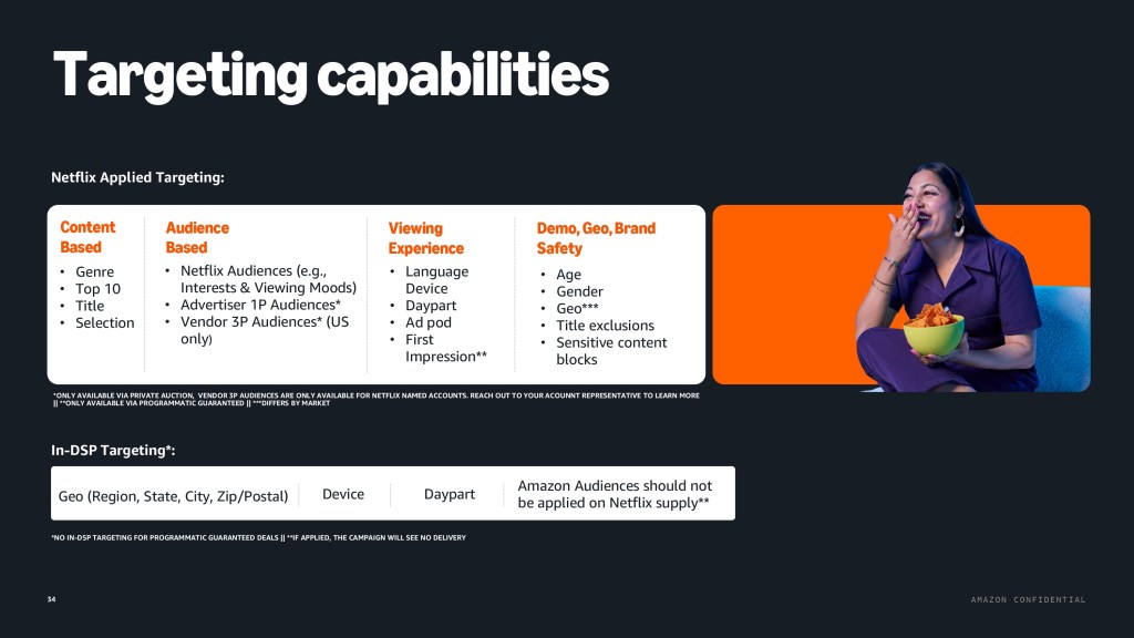 And if advertisers still need convincing as to why they’d choose to purchase Netflix via Amazon’s DSP versus directly, the deck includes a comprehensive list of targeting capabilities.