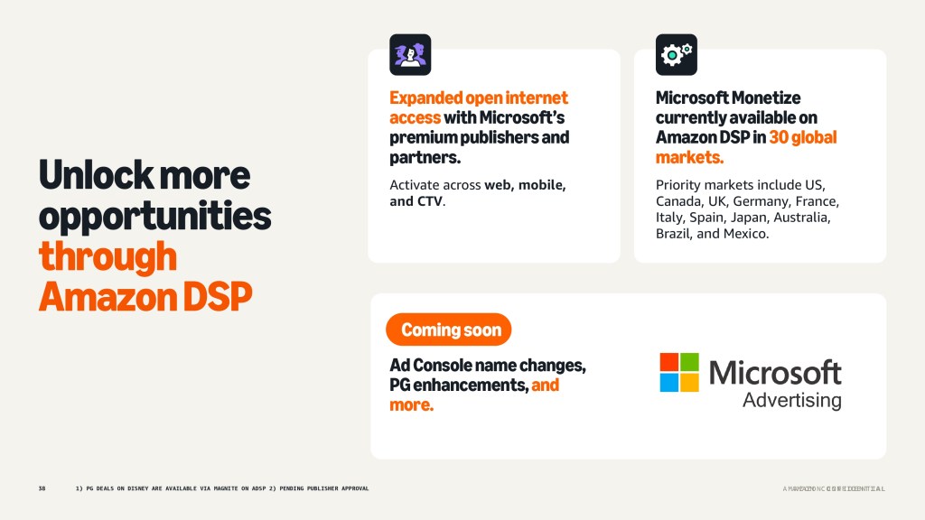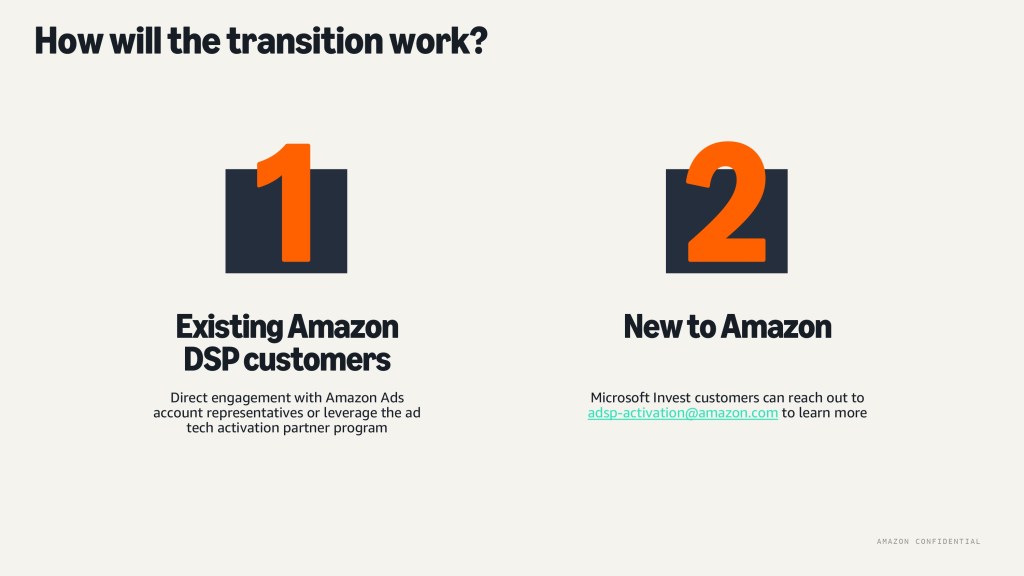 Advertisers can upload their own pre-negotiated deal libraries, access pre-curated deals or even create proposals for custom preferred and programmatic guaranteed deals — whether these are for single or multi-publisher deals. Whether they’re an existing Amazon DSP client, or a Microsoft Invest customer, advertisers will be provided with whatever help they need to ensure the transition is smooth, through Amazon’s DSP platform.