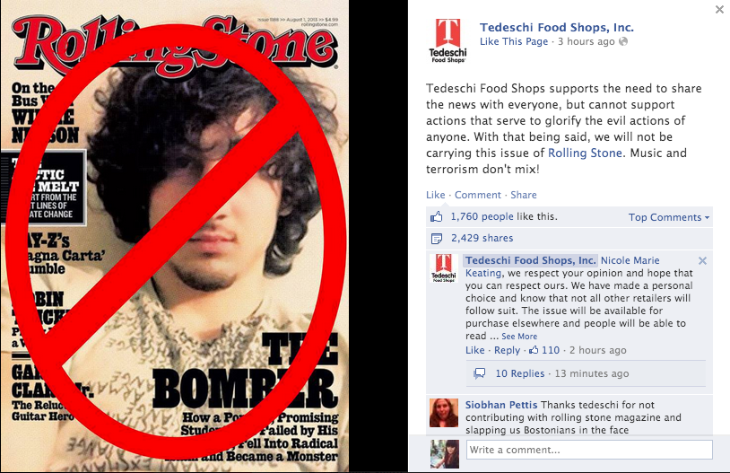 Earlier today Tedeschi Food Shops, a New England convenience store chain, took to Facebook to speak out against Rolling Stone’s cover choice, announcing: “Tedeschi Food Shops supports the need to share the news with everyone, but cannot support actions that serve to glorify the evil actions of anyone. With that being said, we will not be carrying this issue of Rolling Stone. Music and terrorism don’t mix!”