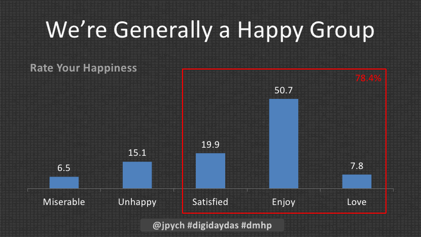 According to a survey of over 600 digital media professionals conducted by Digiday and Nextmark, almost 80 percent of respondents said they were satisfied, enjoy or love their jobs, while just 6.5 percent claimed to be miserable in their current situation. Things are improving, too: Over 75 percent of respondents said their job satisfaction is either the same or greater than it was 12 months prior.