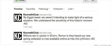 Kenneth Cole, the chairman of the brand Kenneth Cole, often tweets using the company’s official Twitter account and did so right after the protests erupted in Egypt.