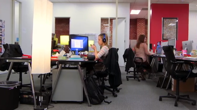 The lab is outfitted with everything employees need for better collaboration: dry-erase walls, movable desks and chairs, and areas specifically designed for brainstorming.