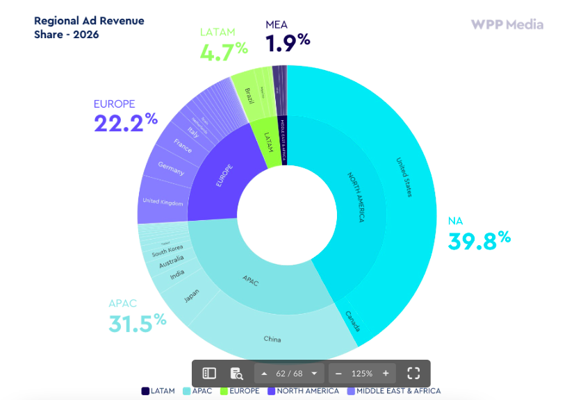North American ad revenue, which totaled $452.9 billion this year, will grow 7.6% in 2026 per WPP’s This Year Next Year report. As usual, the bulk of that spend, and its growth, will come from the United States, though Mexico and Canada’s ad markets should expect an assist from the soccer World Cup. The U.S. is also predicted to see high political ad spend in the run-up to the midterm elections later in the year.