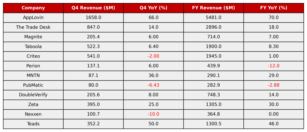 The numbers filed with each company’s respective stock exchange in recent weeks, as shown in the table below, indicate an annual average revenue increase of 17.4% across the sector in 2025.* Although anomalies such as AppLovin (70% growth) and Teads (46% growth post-merger with Outbrain), as well as Perion and PubMatic’s declines of 12% and 2.88%, respectively, warrant closer inspection.