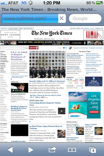 Believe it or not, there are still some publisher sites that still port their desktop version over to the mobile Web. This is just bad form. The worst offender? The New York Times. Its redesign can’t come at a better time, as its mobile site is a carbon copy of the desktop, just tinier. This means you need a lot of patience to get through all the clutter — ads and stories — and it’s next to impossible to navigate.