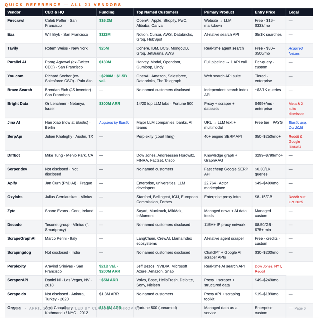 The report identified 21 vendors doing this, including Firecrawl, Exa, Tavily, Brave, You.com, Perplexity Sonar and Bright Data. (TollBit also has a running index on third-party scrapers, identifying nearly 40 vendors.)