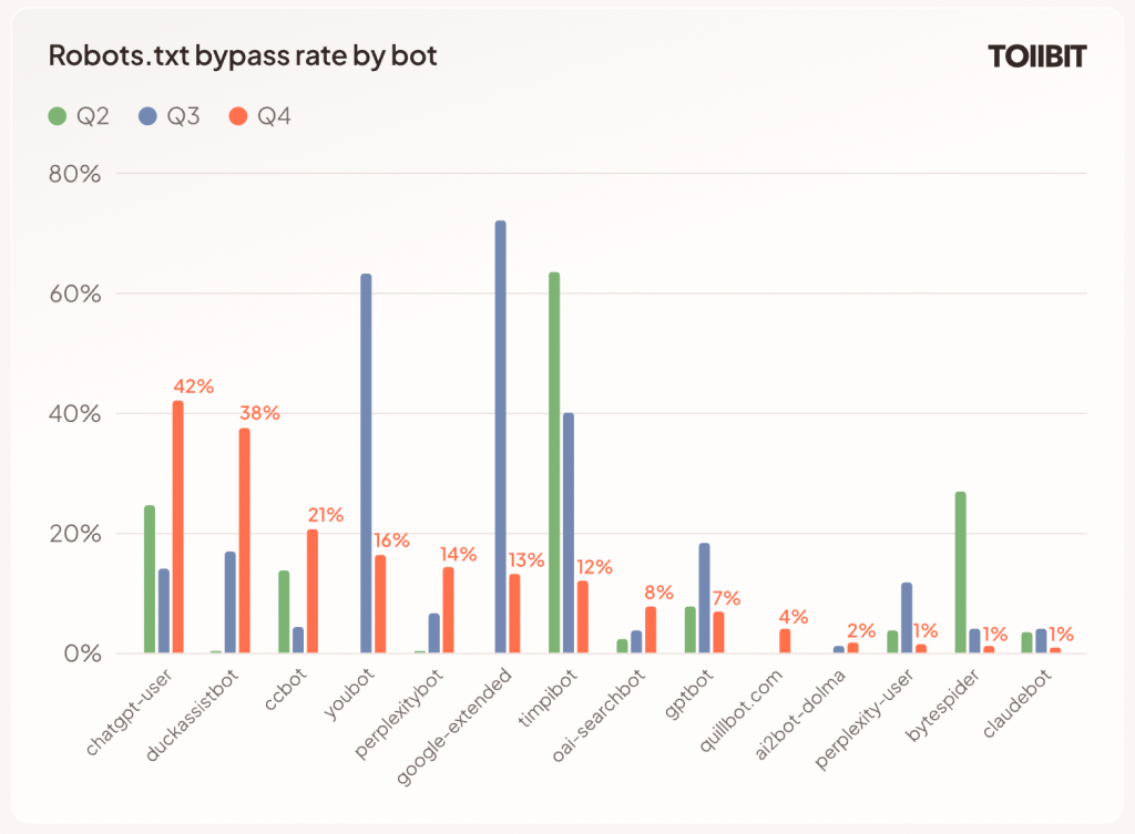 Tollbit’s latest “State of the Bots” report underscored the point. It found that about 30 percent of AI bot scrapes violate explicit instructions in robots.txt to “disallow” web crawlers to access their content.