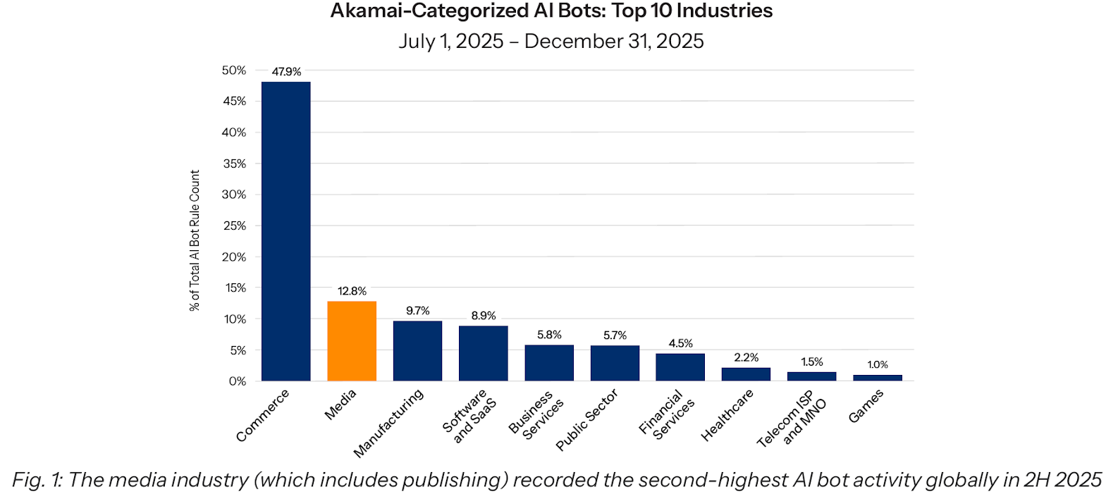 While most of this targeted the commerce industry (48 percent), media was in second place (13 percent), the report said. Specifically, publishers represented 40 percent of all media-related AI bot activity.