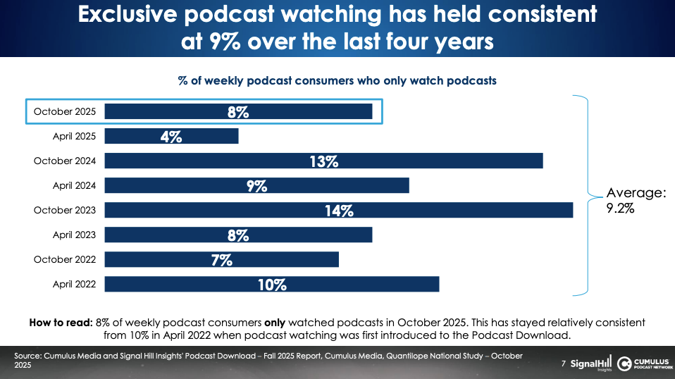 Despite the growth over the years in video podcast production among publishers, creators and audio companies, the percentage of weekly podcast consumers who only watch podcasts hasn’t changed much in the past four years, according to the Cumulus Media and Signal Hill Insights report.