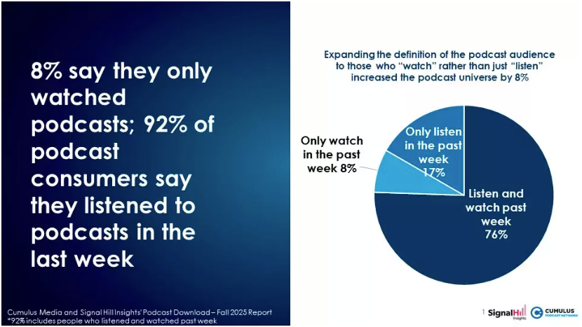 Triton Digital’s findings are similar to the Cumulus Media and Signal Hill Insights’ Podcast Download Fall 2025 Report, which found that 17 percent of podcast consumers choose to listen, while 8 percent say they only watch podcasts – and 76 percent do both.