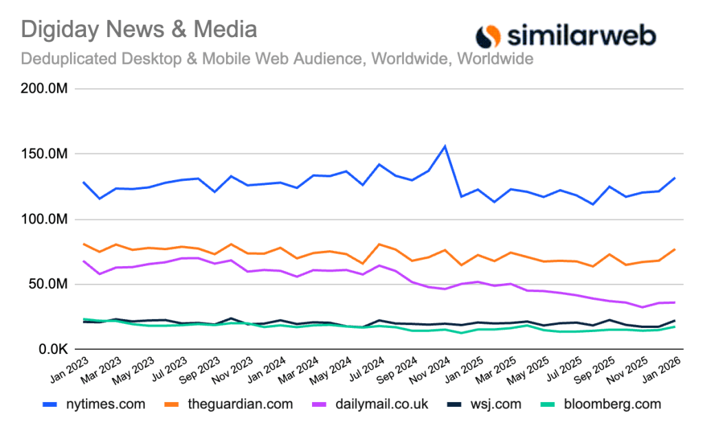 The New York Times grew traffic by 7.5 percent year over year in January, The Guardian by 6.4 percent year over year, The Wall Street Journal by 7.4 percent year over year and Bloomberg by 13.8 percent year over year.