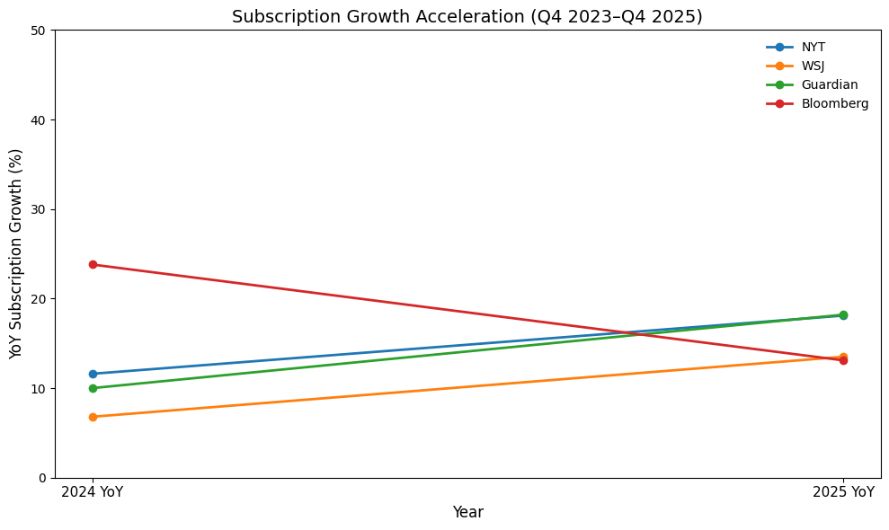 The Guardian recorded the strongest subscription growth acceleration among the legacy publishers, with a jump of 8.2 percentage points. The New York Times’growth accelerated 6.5 percentage points from 2023 to 2025. The Wall Street Journal posted a similar trajectory, with an acceleration of 6.7 percentage points.